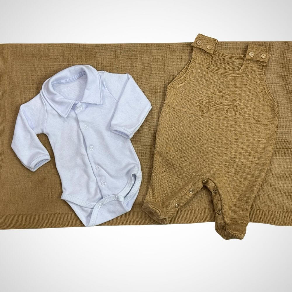 Esse lindo conjunto de 2 peças foi pensado com muito carinho para acolher o bebê com elegância e bem-estar. Composto por uma jardineira estilosa e uma manta super macia e aconchegante, é a escolha perfeita para marcar esse momento especial com todo cuidado.