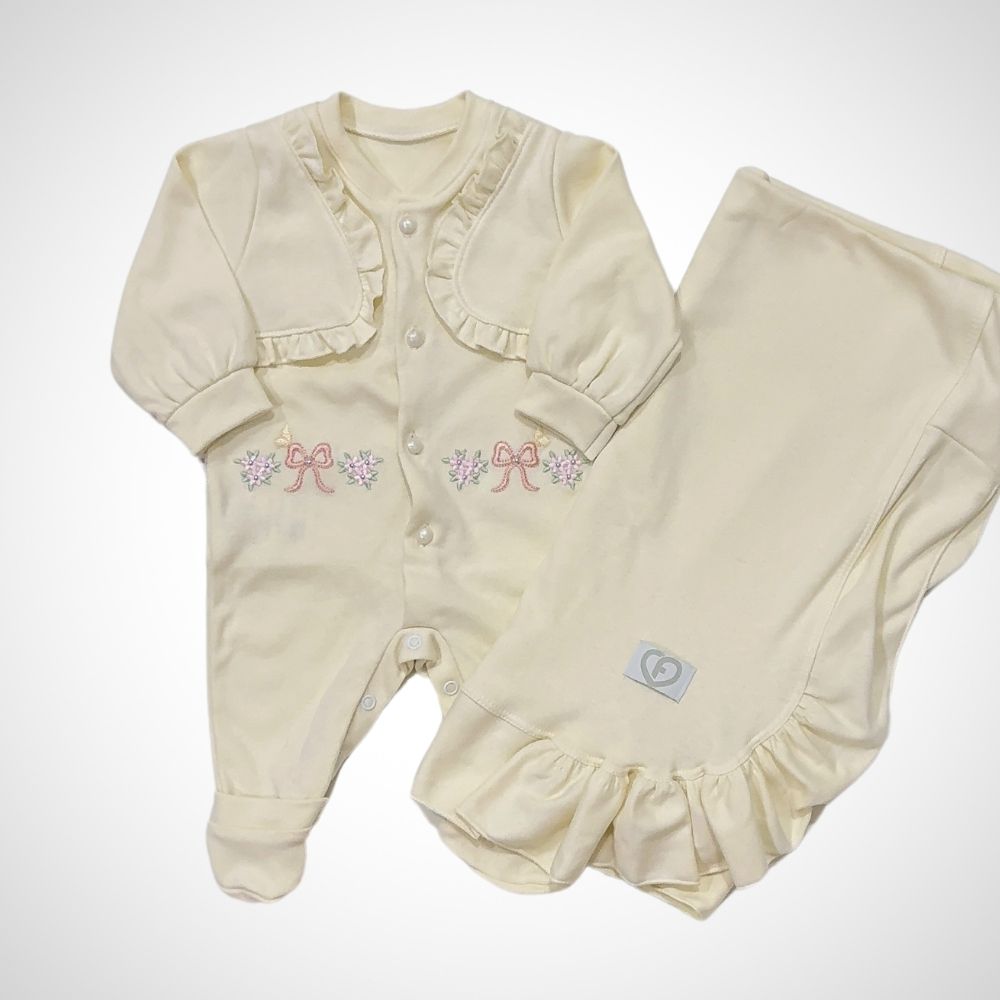 Encante-se com esse conjunto luxuoso de 2 peças, feito com todo carinho para os primeiros momentos da sua bebê. Composto por um macacão delicado e uma manta super aconchegante, é a escolha perfeita para um momento inesquecível.