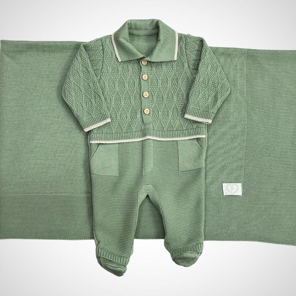 Esse lindo conjunto de 2 peças foi criado com todo carinho para acolher seu recém-nascido com conforto e delicadeza. Composto por um macacão aconchegante e uma manta macia, é ideal para marcar esse momento especial com elegância e amor.