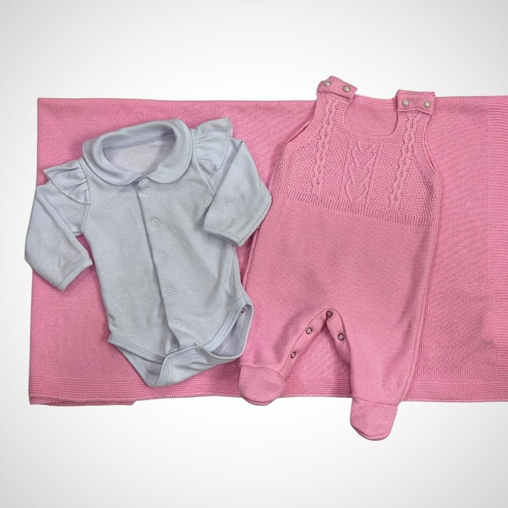 Esse lindo conjunto de 3 peças foi criado com todo carinho para proporcionar conforto, elegância e aconchego desde o nascimento. Composto por uma jardineira encantadora, um body charmoso e uma manta super macia, é a escolha perfeita para envolver sua bebê com amor e cuidado.