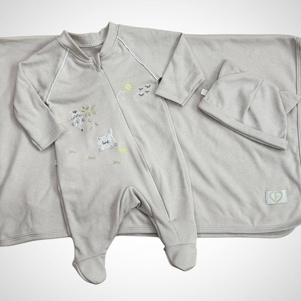 Esse encantador conjunto de 3 peças foi criado com todo carinho para acolher sua bebê com conforto e delicadeza. Composto por um macacão charmoso, um gorro fofo e uma manta super macia e aconchegante, é a escolha perfeita para esse momento tão especial.