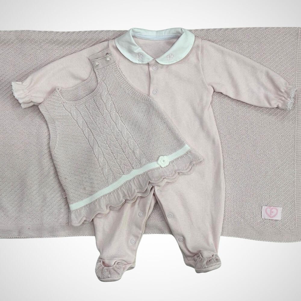 Esse lindo conjunto de 3 peças foi pensado com todo cuidado para os primeiros momentos do recém-nascido. Composto por um macacão delicado, um colete charmoso e uma manta super aconchegante, é a combinação ideal de conforto e elegância.