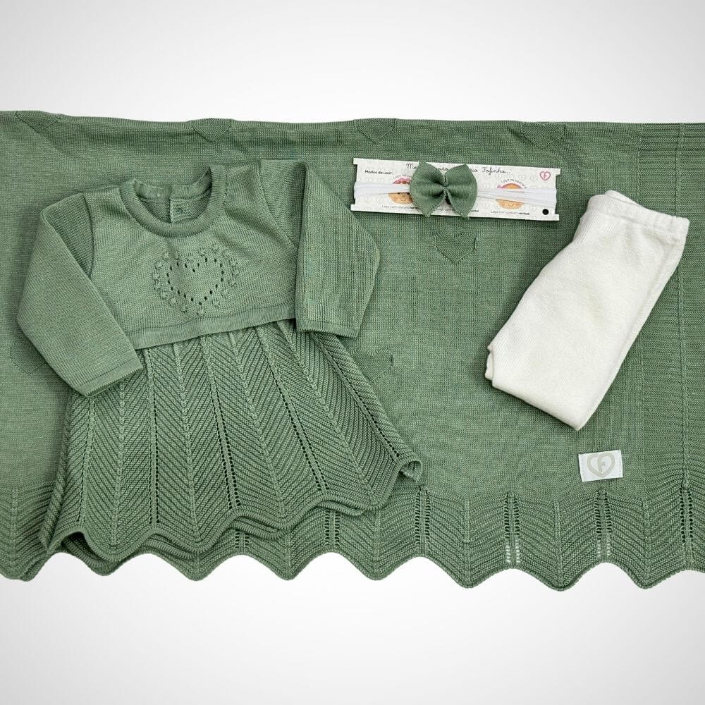 Esse delicado conjunto de 4 peças foi pensado com muito carinho para receber sua bebê com conforto e elegância. Composto por um vestido charmoso, uma meia-calça quentinha, uma tiara delicada e uma manta aconchegante, é perfeito para esse momento tão especial.