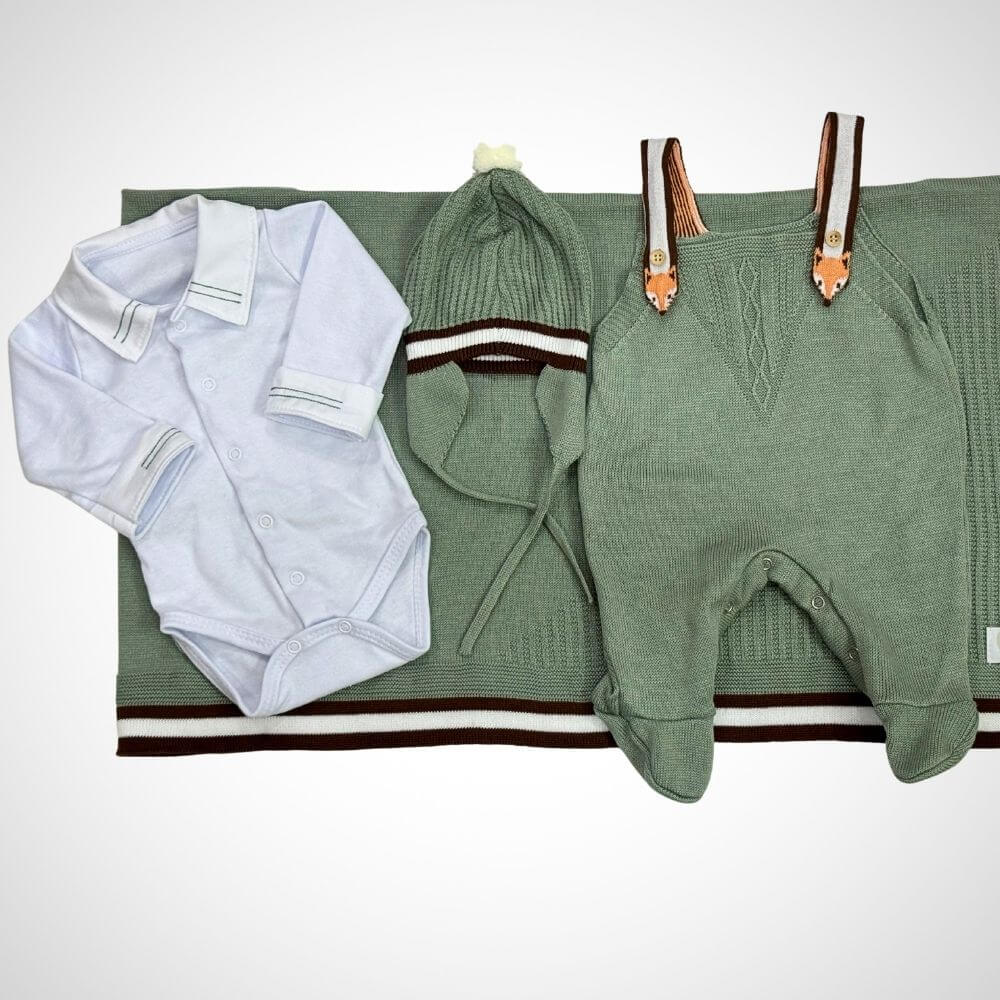 Esse lindo conjunto de 4 peças foi desenvolvido com todo carinho para acolher o bebê com bem-estar e elegância. Composto por uma jardineira estilosa, um body charmoso, um gorro delicado e uma manta super aconchegante, é a escolha ideal para esse momento tão especial.