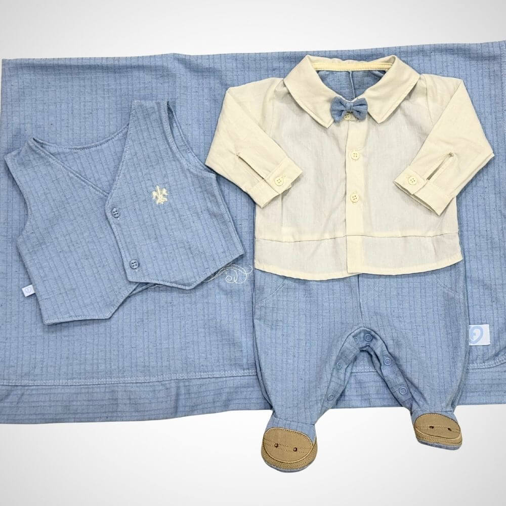 Esse elegante conjunto de 4 peças foi desenvolvido com todo carinho para acolher o recém-nascido com conforto e sofisticação. Acompanha um macacão delicado, uma gravata charmosa, um colete estiloso e uma manta super macia e aconchegante, perfeita para envolver seu pequeno com muito amor.
