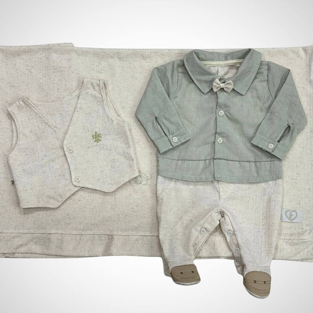Esse elegante conjunto de 4 peças foi desenvolvido com todo carinho para acolher o recém-nascido com conforto e sofisticação. Acompanha um macacão delicado, uma gravata charmosa, um colete estiloso e uma manta super macia e aconchegante, perfeita para envolver seu pequeno com muito amor.