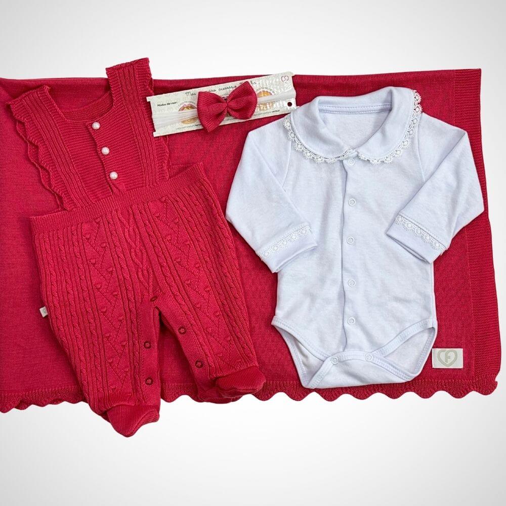 Esse delicado conjunto de 4 peças foi pensado com muito carinho para oferecer conforto, charme e elegância desde o nascimento. Composto por uma jardineira fofa, um body charmoso, uma tiara delicada e uma linda manta super aconchegante e macia, é perfeito para envolver sua bebê com amor e estilo.
