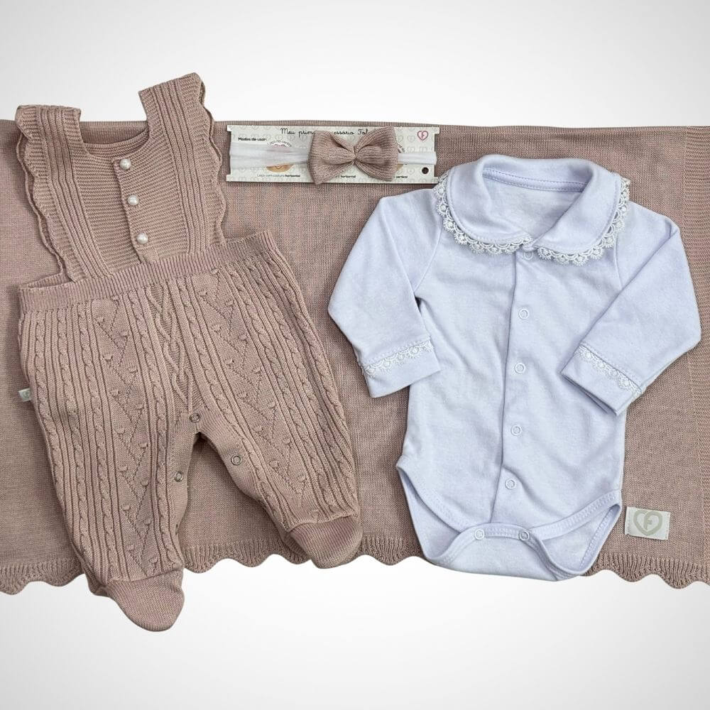 Esse delicado conjunto de 4 peças foi pensado com muito carinho para oferecer conforto, charme e elegância desde o nascimento. Composto por uma jardineira fofa, um body charmoso, uma tiara delicada e uma linda manta super aconchegante e macia, é perfeito para envolver sua bebê com amor e estilo.