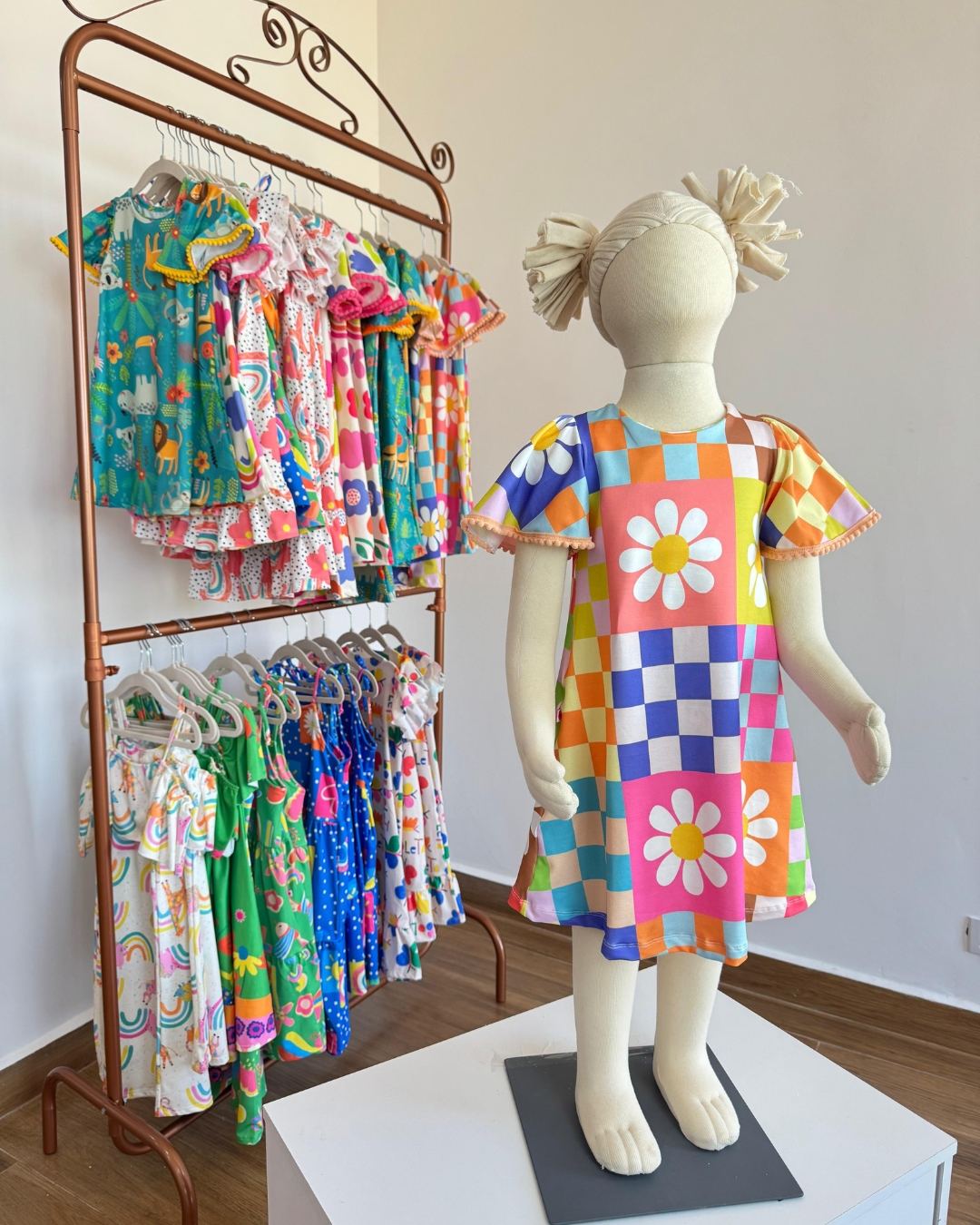 A estampa é um verdadeiro destaque: um mix de quadriculados coloridos em tons vivos como rosa, azul, laranja, amarelo, verde e lilás, intercalados com grandes margaridas brancas de miolo amarelo, criando um visual retrô e super divertido. As mangas curtas são em estilo "borboleta", com leve franzido no ombro e acabamento com delicado pompom em tom coral claro, que adiciona um charme especial.
