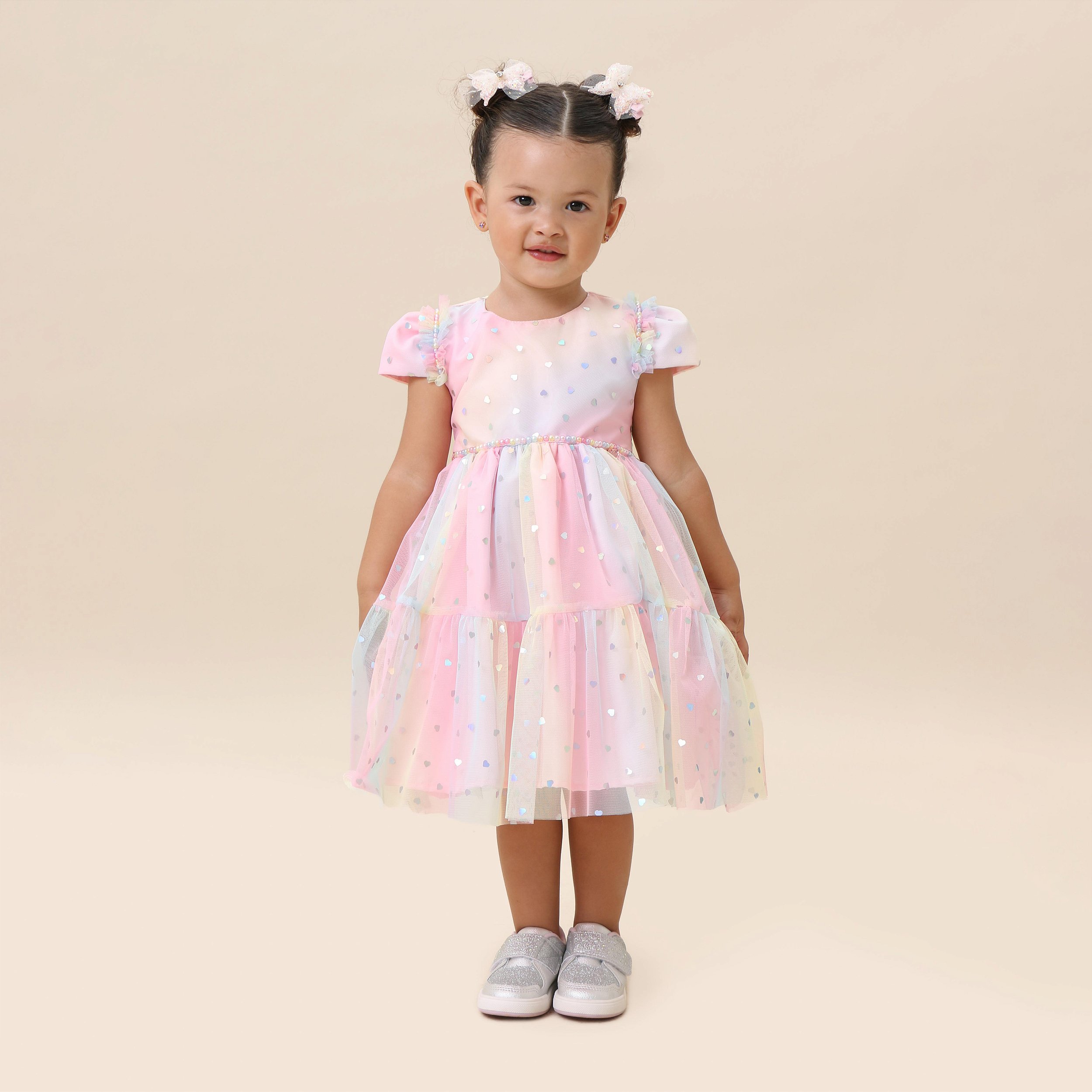 Este encantador vestido infantil é um verdadeiro sonho colorido! Com base em tom rosa suave e sobreposição em tule com pequenos corações holográficos, ele brilha delicadamente a cada movimento. As mangas curtas contam com babadinhos em tule arco-íris e detalhe de pérolas, deixando o visual ainda mais gracioso. A cintura é marcada por uma faixa de pérolas coloridas que complementa o design mágico e alegre. A saia leve e volumosa completa o look com um toque de fantasia — perfeito para festas, aniversários e momentos cheios de encanto.