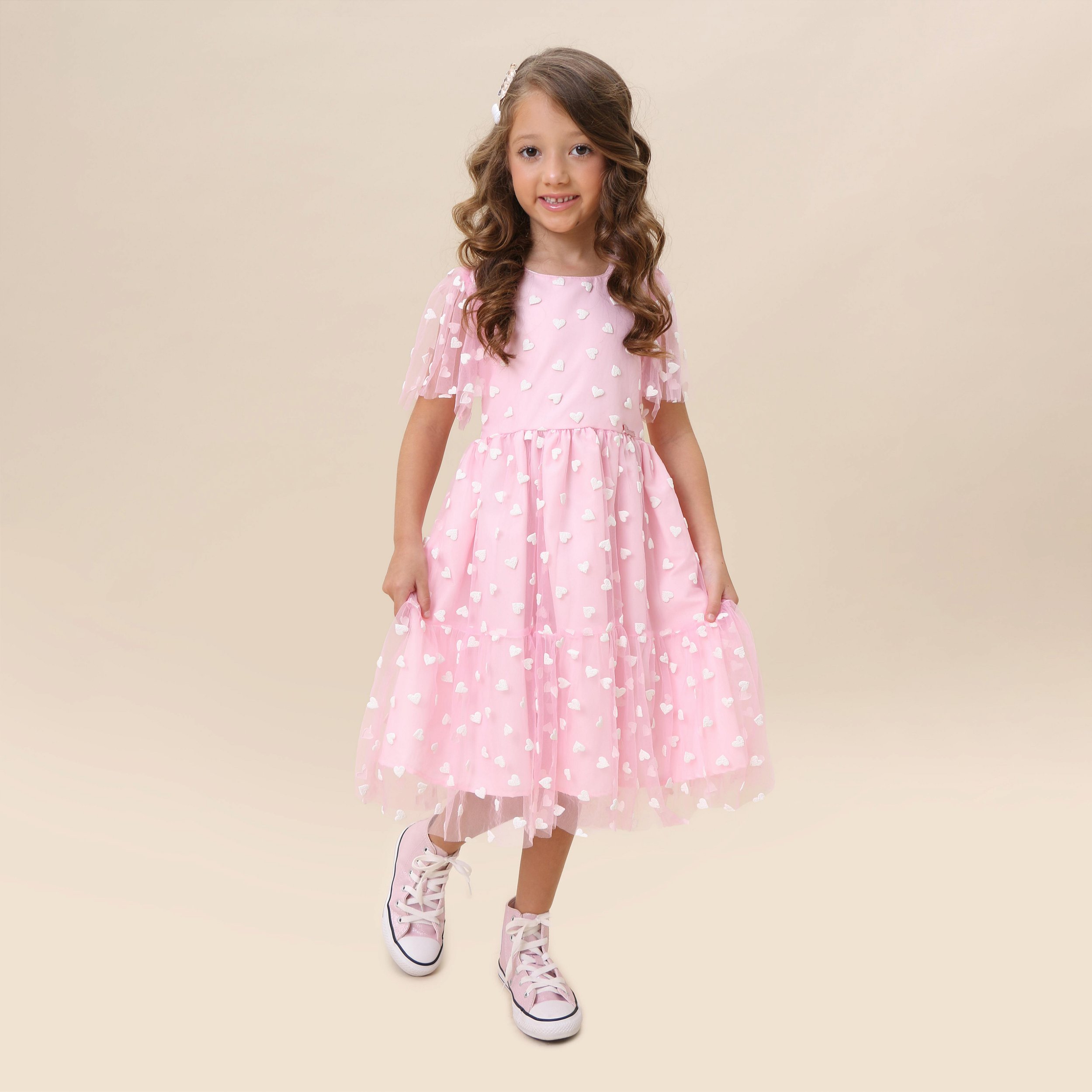 Este adorável vestido infantil rosa é cheio de charme e delicadeza. Confeccionado em tecido leve e fluido, ele apresenta aplicações de pequenos coraçõezinhos brancos em relevo por todo o corpete e a saia, criando um visual romântico e encantador. As mangas curtas de tule transparente com detalhes de corações trazem um toque suave e gracioso, enquanto a saia levemente volumosa garante movimento e leveza. Perfeito para festas, aniversários e momentos especiais, este vestido é pura doçura em forma de roupa.